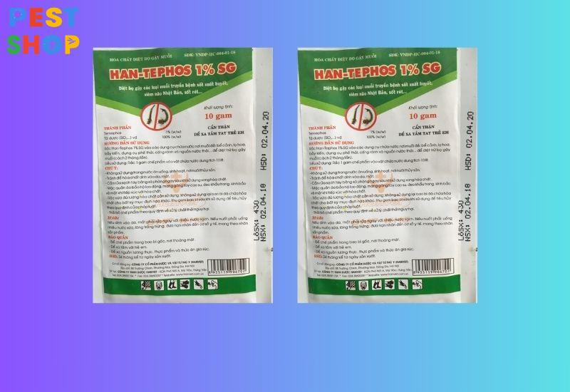 - Các hoạt chất chính Temephos 1% (w/w) của Han-Tephos 1%. Sản phẩm đã được bộ y tế kiểm định và khuyến cáo sử dụng. Trong công tác phòng dịch, diệt muỗi, kiểm soát dịch bệnh sốt xuất huyết, sốt rét, …..