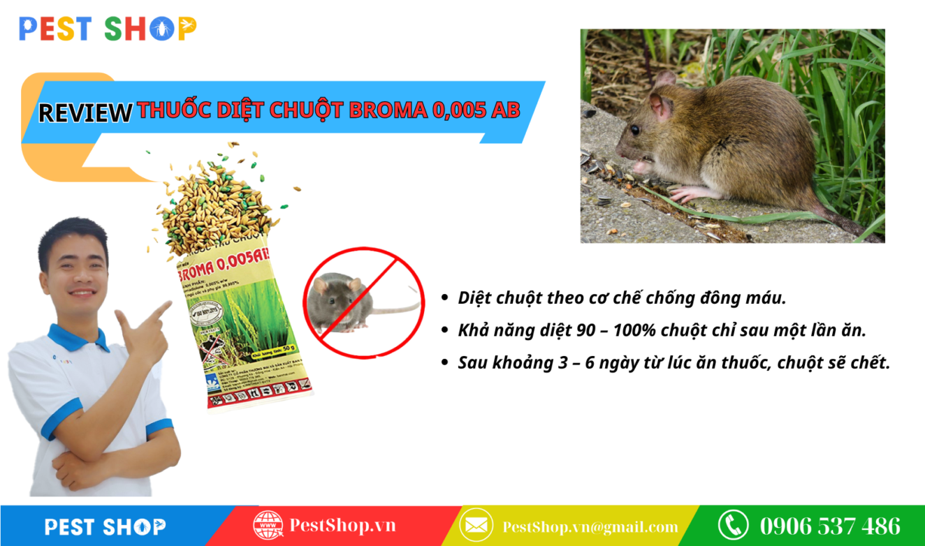Thuốc diệt chuột Broma 0,005 AB đang ngày càng được ưa chuộng nhờ vào hiệu quả và tính năng vượt trội của nó. Trong bài viết này, Pestshop sẽ giới thiệu chi tiết về thành phần, cơ chế hoạt động và hướng dẫn sử dụng sản phẩm. Mời bạn tham khảo nhé.