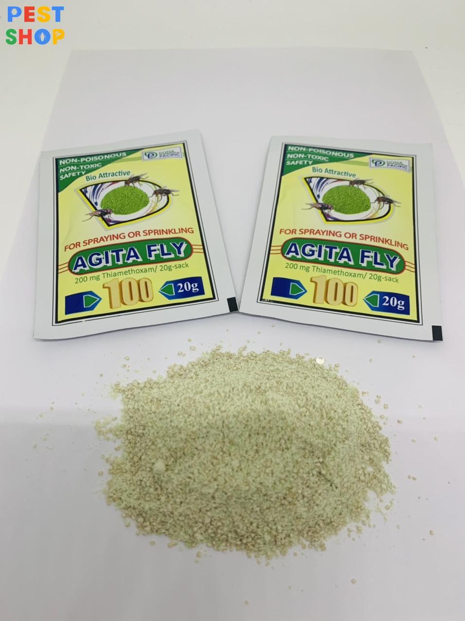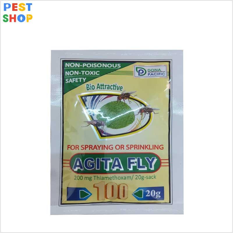 - Pha mỗi 20g bột diệt ruồi Agita Fly 100 cho 1 lít nước. Phun trực tiếp lên ruồi để tiêu diệt chúng hoặc phun vào các bề mặt để hóa chất tồn lưu để xua đuổi ruồi.