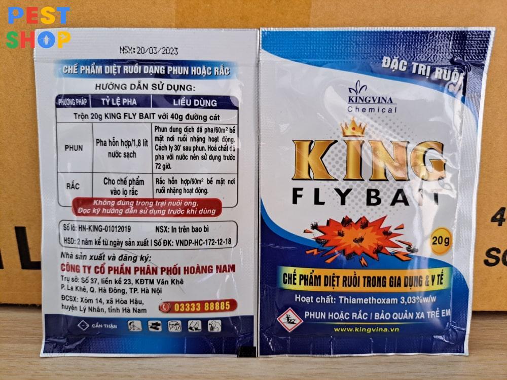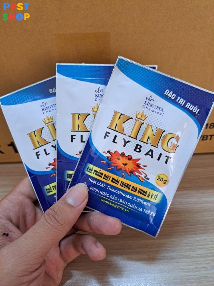 - Qui cách KING FLY BAIT được lựa chọn cách đóng dạng gói 20 gram rất tiện dụng, dễ bảo quản và tiết kiệm theo nhu cầu dân dụng và các công ty kiểm soát côn trùng chuyên nghiệp để kiểm soát tiêu diệt các loài ruồi nhặng.