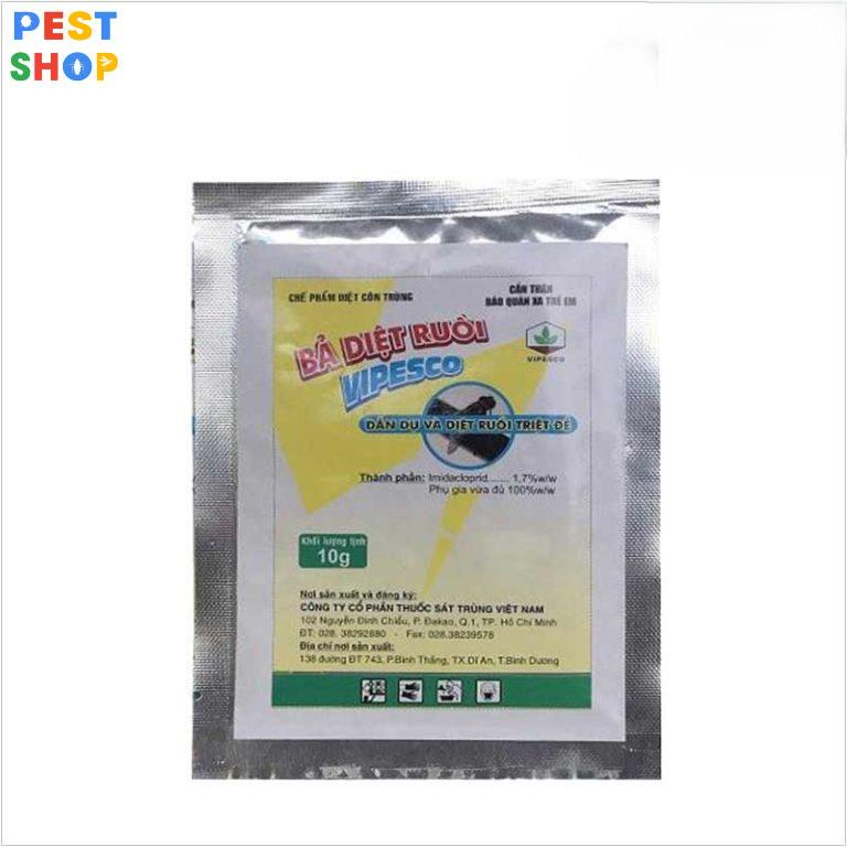 Bả diệt ruồi Vipesco là sản phẩm diệt ruồi có xuất xứ tại Vipesco Việt Nam. Trong thuốc có thành phần Imidacloprid, giúp dẫn dụ côn trùng ăn bả và chết ngay sau đó. Bả diệt ruồi Vipesco tồn tại ở dạng hạt, chứa hoạt chất hoàn toàn mới là Imidacloprid, dẫn dụ và diệt ruồi triệt để, hiệu quả cao. Chế phẩm không mùi được khuyên dùng trong nhà ở, nơi chế biến thực phẩm trong nhà hàng, khách sạn..