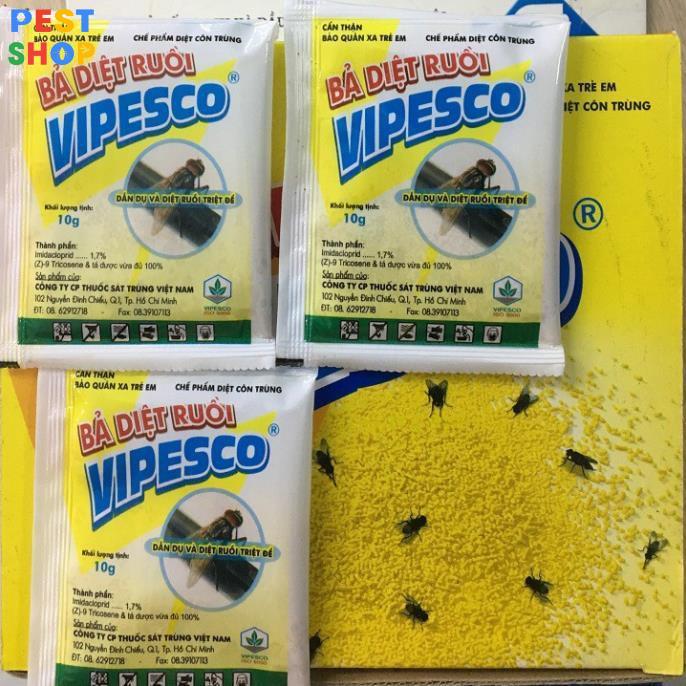 - Thuốc diệt được các loại ruồi khác nhau. Dựa theo tập tính tìm mồi của ruồi, bả diệt ruồi Vipesco được sản xuất dưới dạng hạt, có mùi và vị thu hút ruồi. Ruồi sẽ chết ngay sau khi ăn bả.