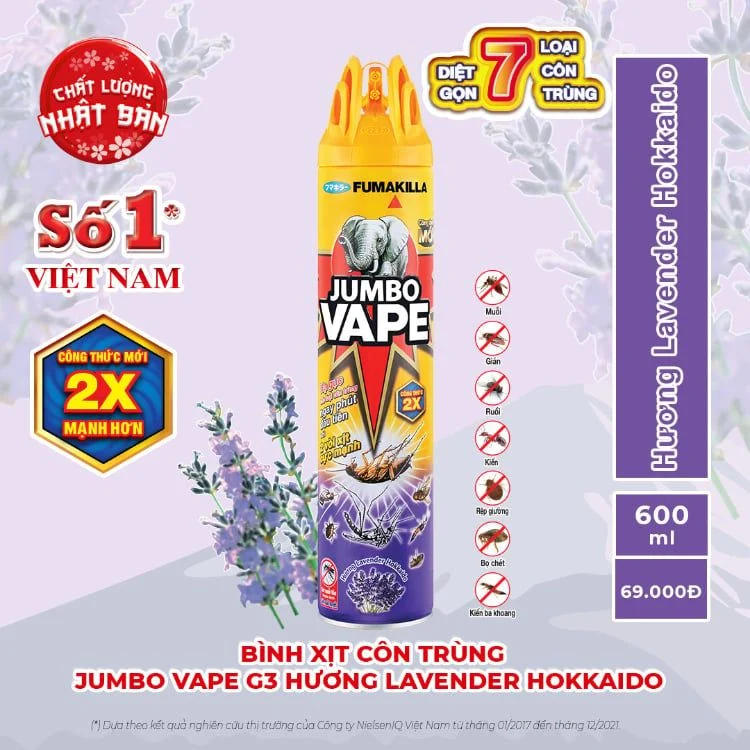 Chai xịt côn trùng Jumbo Vape G3 hương lavender Pháp 600ml dùng để diệt muỗi ruồi kiến gián trong gia dụng và y tế.