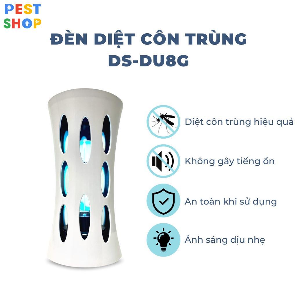 - Đèn bắt muỗi Pest shop DS-DU8G được thiết kế với bóng đèn đặc biệt thu hút côn trùng bay vào đèn, khi côn trùng va vào tấm keo dính sẽ bi dính chặt vào tấm keo và bị diệt sau đó.