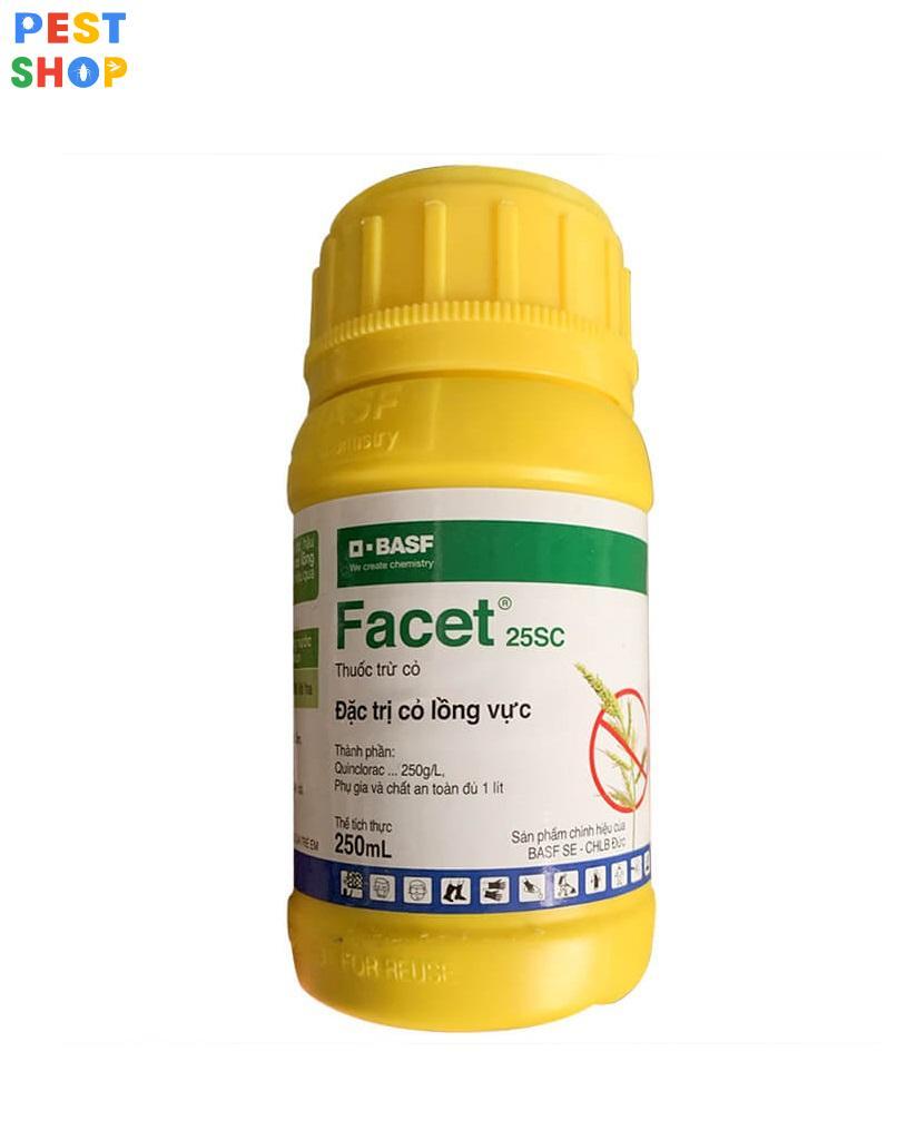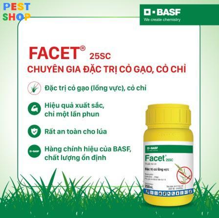 Facet 25SC thuốc trừ cỏ chọn lọc, hậu nảy mầm chuyên dùng cho lúa. Cỏ mần trầu, cỏ chỉ, cỏ lá tre, cỏ đuôi phụng, cỏ lông, cỏ cúc trắng, rau muống, rau dền dại, rau sam, rau mương, rau mác…