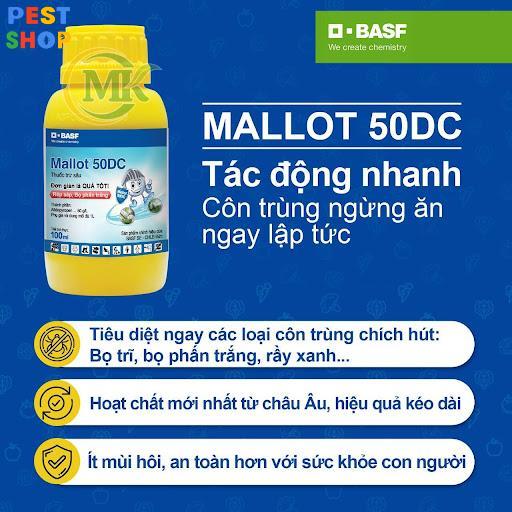 - Mallot 50DC dạng “DC” là công nghệ tiên tiến nhất trên toàn thế giới. Giúp thấm sâu nhanh vào cây trồng, tiêu diệt cả côn trùng ở mặt trên và mặt dưới lá.