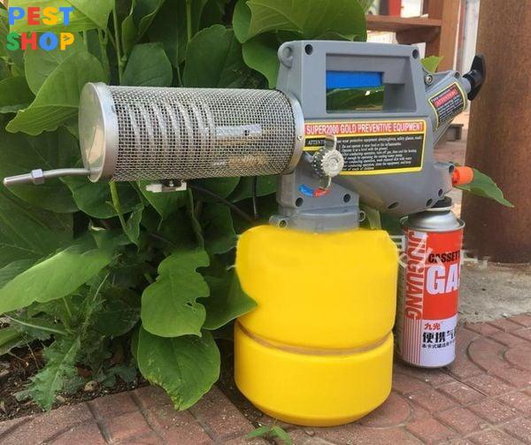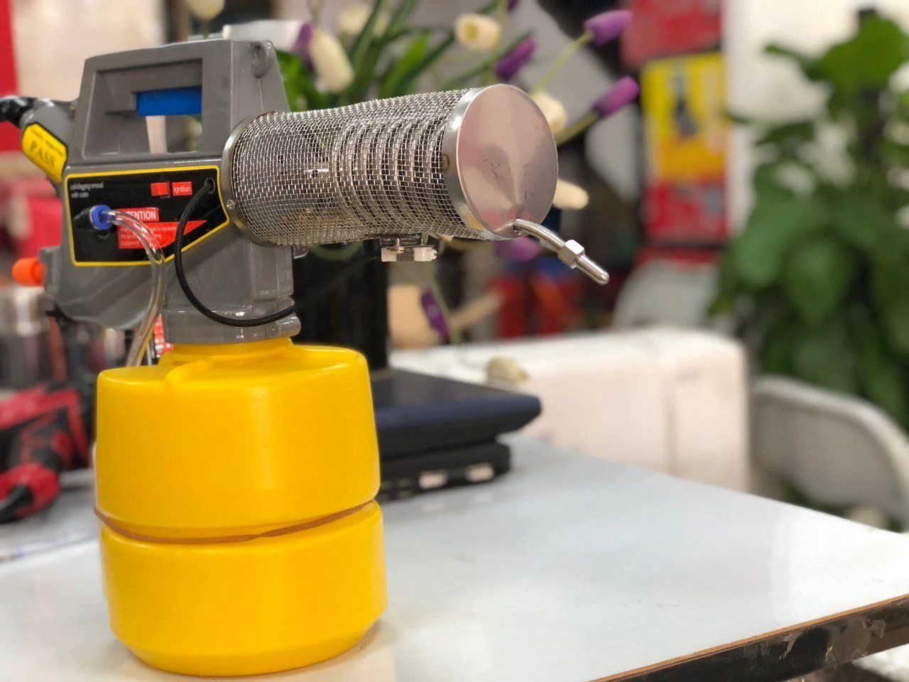 - Sau khi khởi động thì tháo van bình đựng hóa chất và bất đầu phun khói.