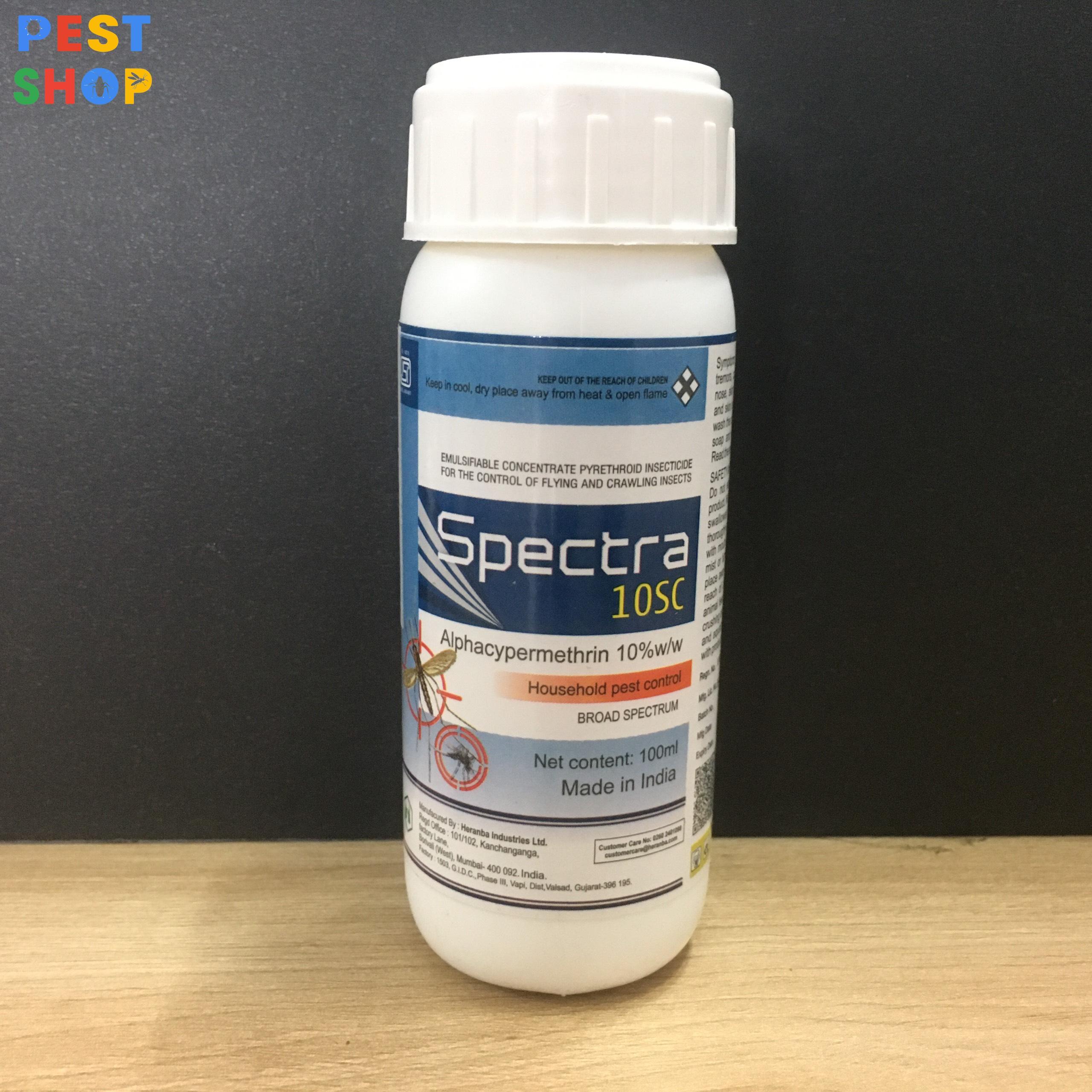 - Spectra 10SC là chế phẩm diệt côn trùng dạng huyền phù, có công dụng phòng trừ các loài gây hại trong nhà như muỗi, gián, kiến, ruồi, bọ chét. Hóa chất được nhập khẩu nguyên chai từ hãng Heranba của Ấn Độ, một thương hiệu uy tín nhiều năm qua tại thị trường Đông Nam Á.