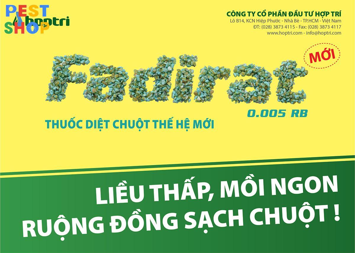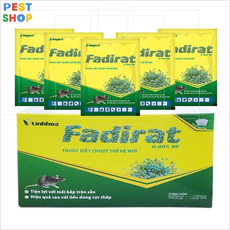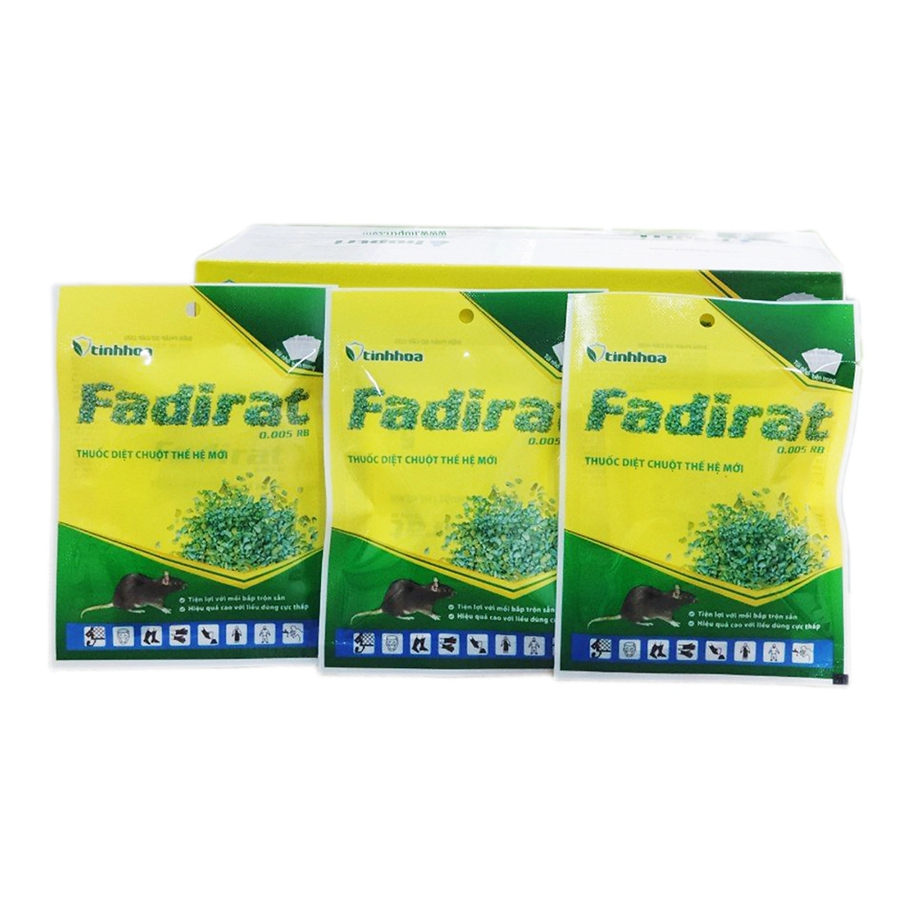 - Thuốc diệt chuột Fadirat 0.005 RB hoạt chất chống đông máu thế hệ mới, dạng đơn liều, chuột chỉ cần ăn một lượng thuốc rất nhỏ và chỉ cần ăn một lần là đủ chết (chuột khoảng 250g chỉ cần ăn khoảng 1.3g thuốc). FADIRAT 0.005RB đã được trộn sẵn mồi bắp/ngô hấp dẫn, sử dụng ngay, không cần thêm bất cứ mồi nào khác.