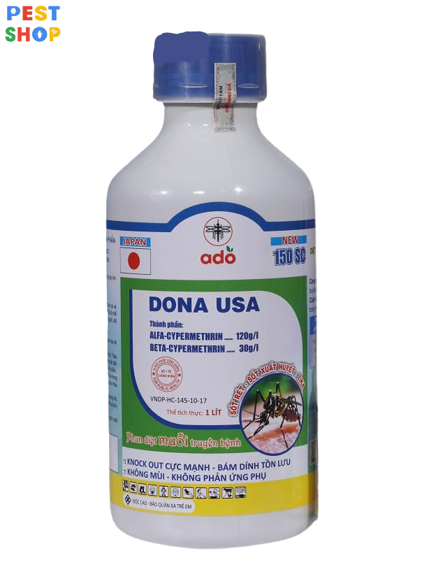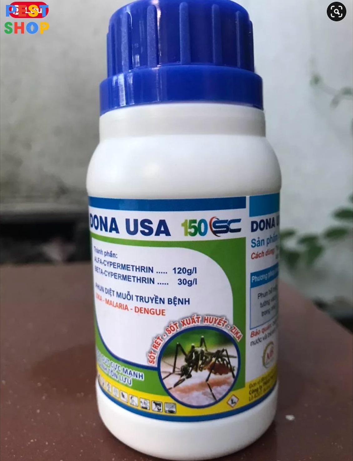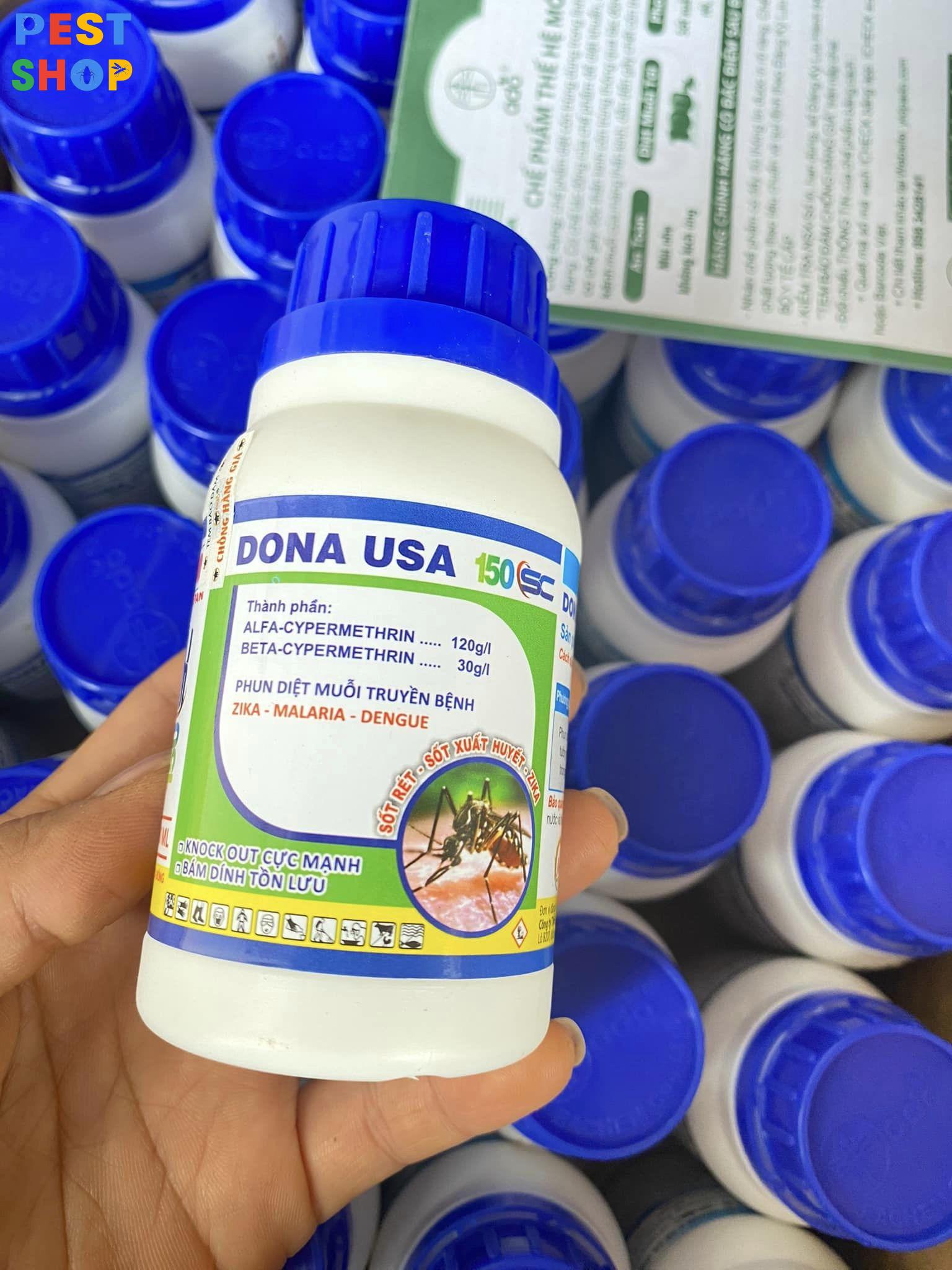 - Dona USA 150SC là chế phẩm thuốc diệt muỗi sinh học. Chế phẩm này có công dụng loại bỏ các loài côn trùng gây hại trong gia dụng và y tế. Thuốc diệt muỗi Dona USA 150SC không chỉ diệt muỗi mà nó còn có thể dùng để diệt gián, kiến, bọ chét và ruồi.