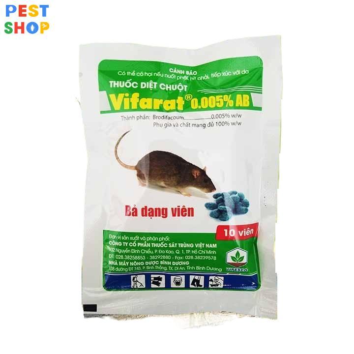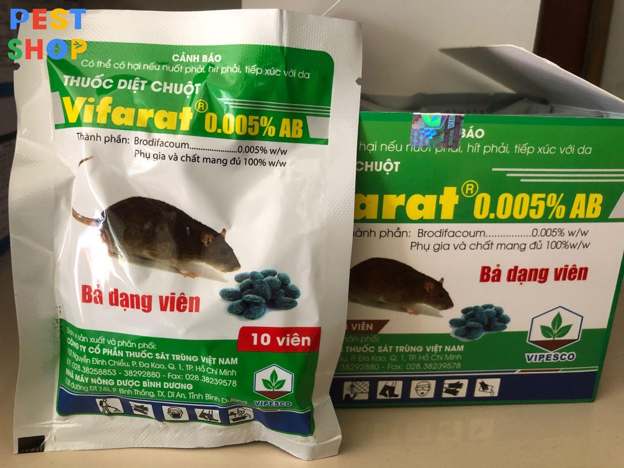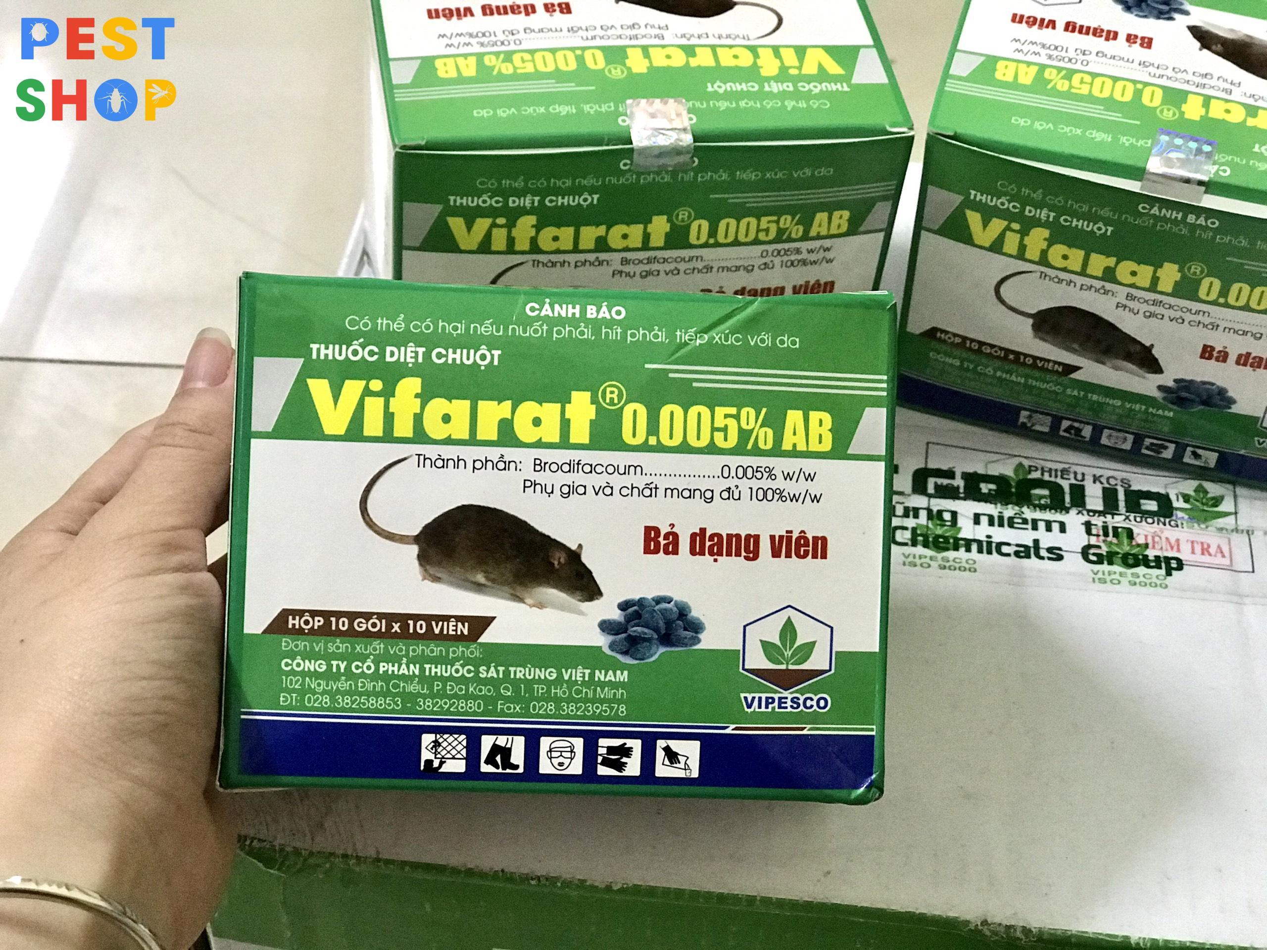Vifarat 0.005% AB là thuốc diệt chuột thế hệ mới. Thuốc có xuất xứ từ Việt Nam nên có giá thành khá rẻ, hiệu quả diệt chuột cao. Vifarat 0.005% AB được coi là khắc tinh của loài chuột.