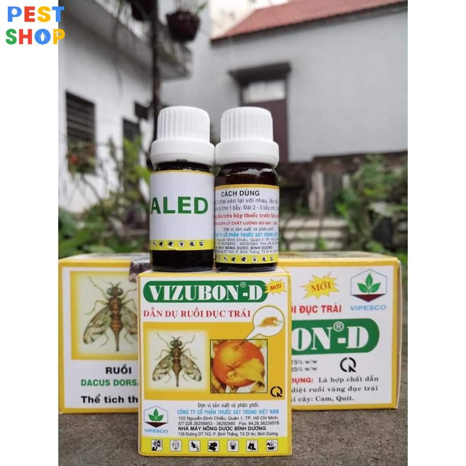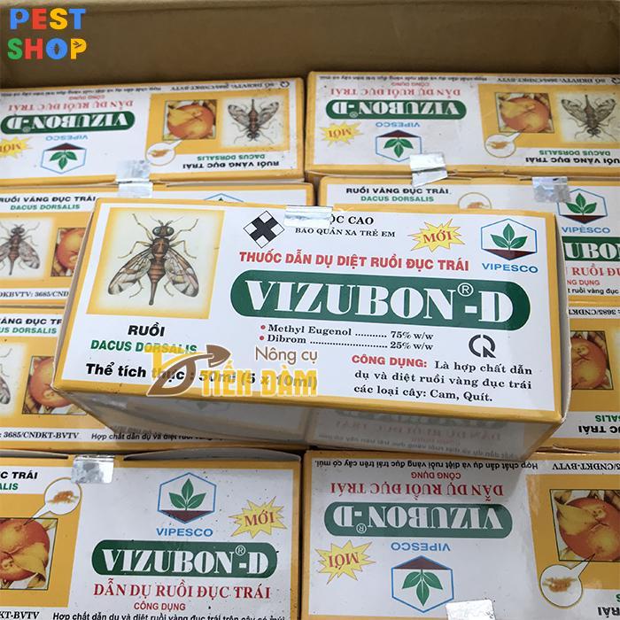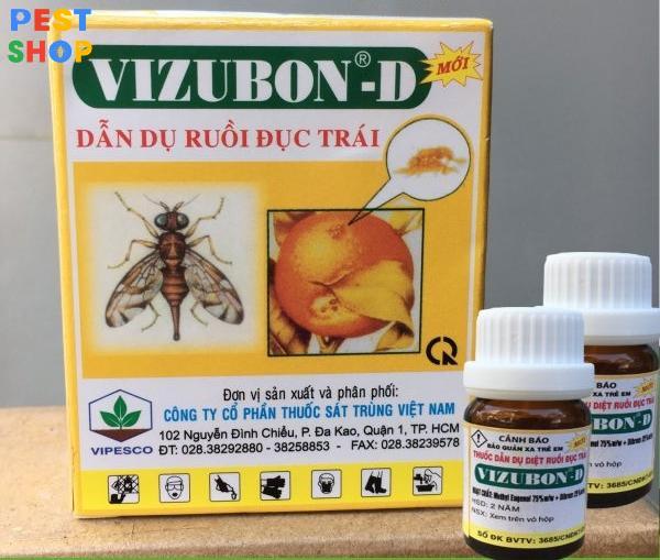 Thuốc diệt ruồi vàng Vizubon-D nằm trong Danh mục thuốc Bảo vệ Thực vật được phép sử dụng ở Việt Nam Đây là thuốc sinh học không thể thiếu khi sử dụng biện pháp thủ công dùng bả sinh học để diệt các loại ruồi gây hại cho hoa màu và cây trồng. Một số nhà vườn thường lo ngại về việc sử dụng thuốc sẽ nôi kéo ruồi nơi khác kéo về. Thuốc là hợp chất dẫn dụ trong phạm vi bán kính nhỏ. Trong bán kính khu vườn nhà mình tất cả các loại ruồi nhất là ruồi vàng đều không cưỡng lại được và sẽ bị tiêu diệt. Cùng với PestShop tìm hiểu kỹ hơn về thuốc diệt Ruồi Vizubon-D này nhé!