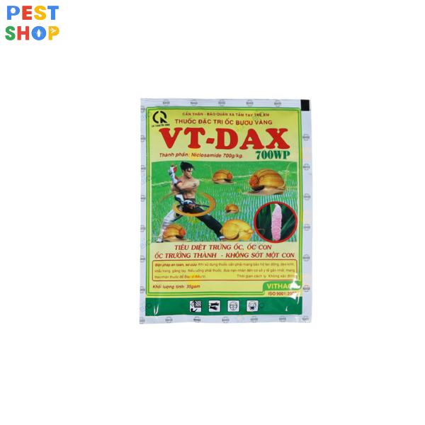 Thuốc trừ ốc VT – Dax 700WP là thuốc bảo vệ thực vật diệt ốc bươu vàng hại lúa có tác động xông hơi vị độc, làm ức chế men hô hấp và trao đổi chất lượng cơ thể của ốc, thuốc tiếp xúc với trứng, làm ung trứng, thối trứng, làm cho trứng không nở thành ốc con.