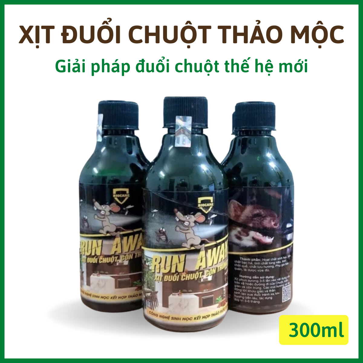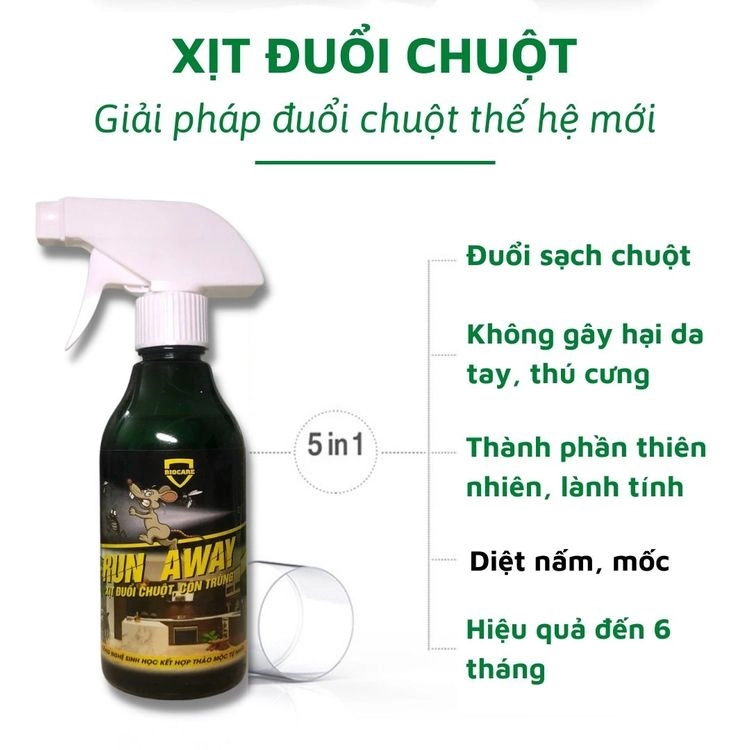 - Với bình xịt đuổi chuột Run Away , bạn sẽ có một giải pháp an toàn, hiệu quả và tiện lợi để loại bỏ hoàn toàn sự gây phiền toái của chuột trong không gian sống và làm việc của mình.